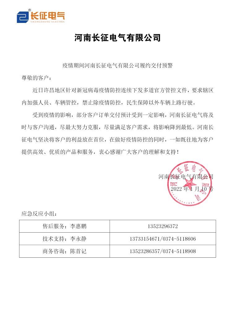 疫情期間河南長(zhǎng)征電氣有限公司履約交付預(yù)警